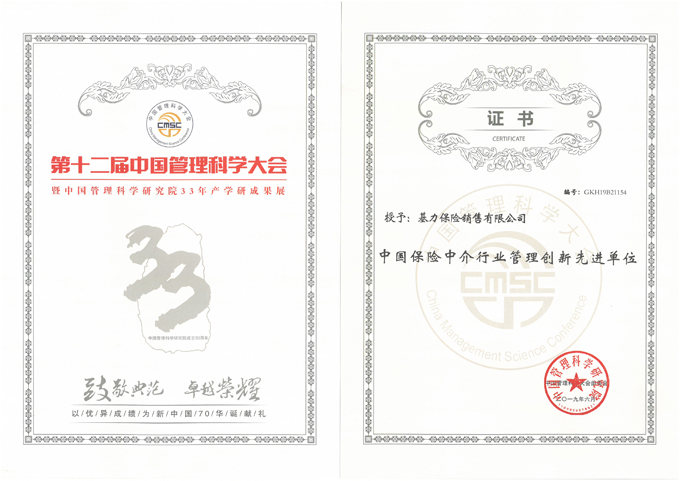 基力保险销售有限公司荣获第十二届中国管理科学家大会荣誉